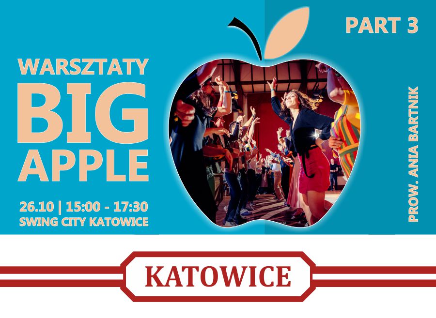 Zapraszamy na III część warsztatów Big Apple, czyli naukę jednego z najsłynniejszych układów solowych. Jeżeli jesteście stałymi bywalcami dużych imprez wiecie, że Big Apple warto znać, bo jest wspólnie odtańczany równie często, jak kultowy Shim Sham. Zajęcia poprowadzi Ania Bartnik i gwarantujemy, że będą to ponad dwie godziny super zabawy i kreatywnej pracy.